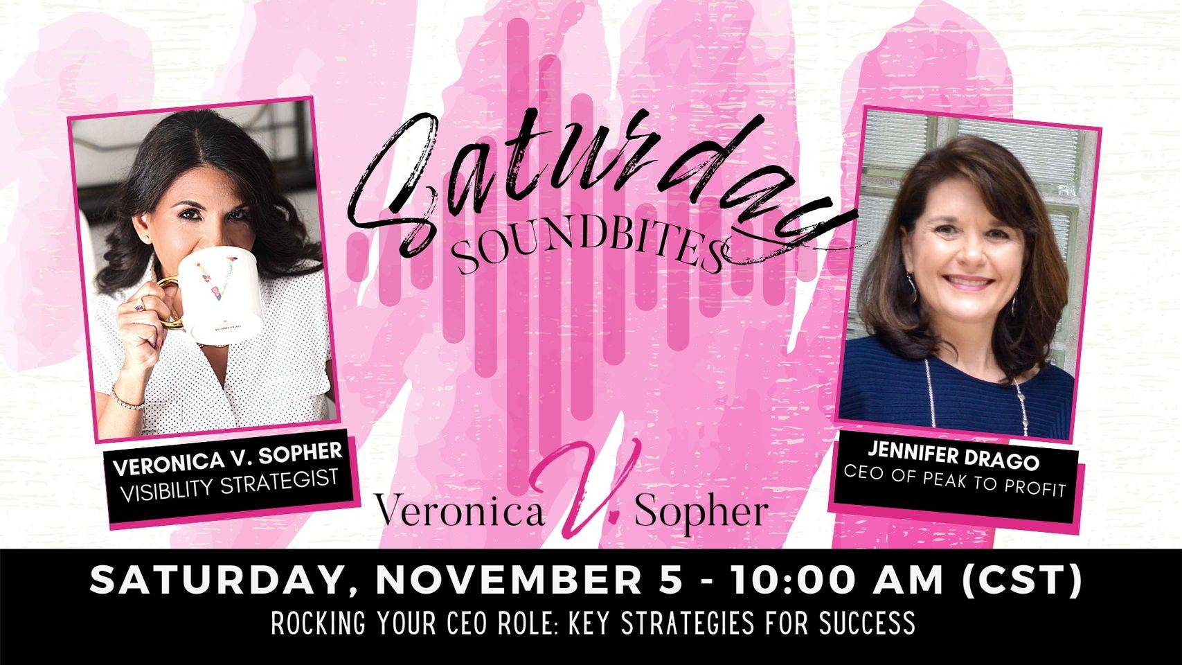 If you have some time on Saturday morning at 8 am PST/10 am CST, grab your favorite beverage and watch me on Veronica Sopher’s Facebook Live show, “Saturday Soundbites.” I am honored to be her guest and we discuss “How to Rock Your Role as CEO of Your Business!”